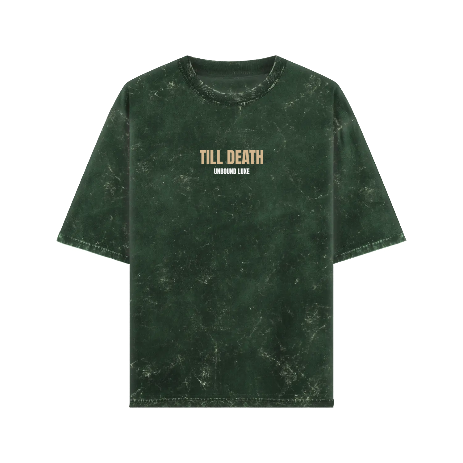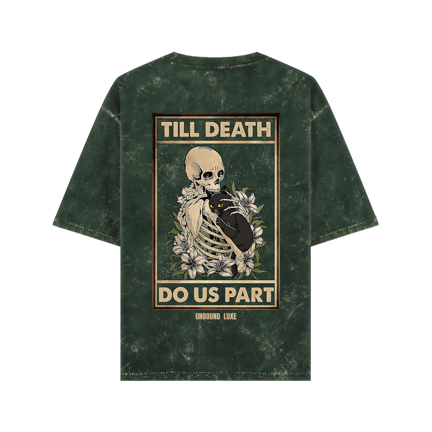 The “Till Death” Acid Wash Tee in bottle green blends vintage-worn texture with bold streetwear energy. Featuring front text print and a back graphic of a skeleton with a black cat, this oversized tee is built for Gen Z rebels who live by their own code.